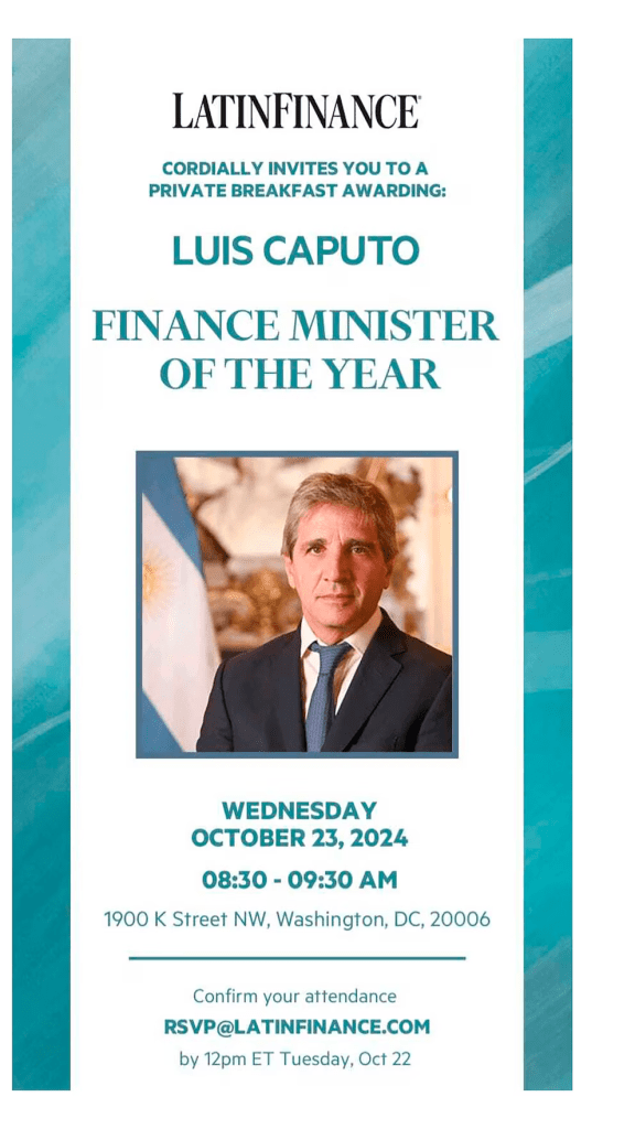 El ministro Luis Caputo será premiado este miércoles en Washington como “ministro de Finanzas” del año, un reconocimiento que entrega anualmente la influyente publicación especializada LatinFinance. El reconocimiento fue celebrado en la red social X, ex Twitter, por el propio presidente Javier Milei.