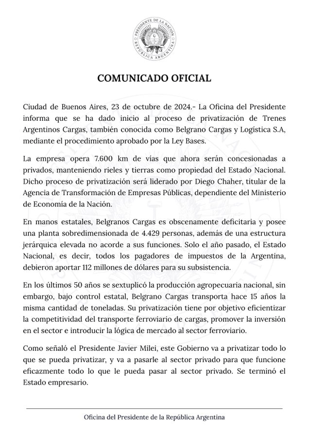«Producto de la ley bases se procederá a privatizar la empresa estatal Belgrano Cargas y Logística SA, en lo que será la primera privatización de una empresa ferroviaria desde la asunción de Javier Milei«, afirmó Adorni. El Gobierno además aseguró que, durante 2023, la compañía estatal recibió u$s112 millones.