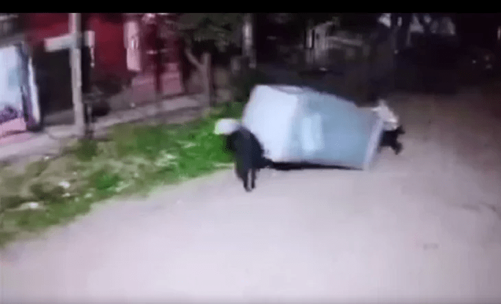 Las cámaras de seguridad de la zona registraron las imágenes que permitieron ver cómo dos hombres que llevaban el baño químico arrastrándolo por la calle. El hecho ocurrió en la intersección de Leandro N. Alem y Pedro Flores, en el partido de Merlo.