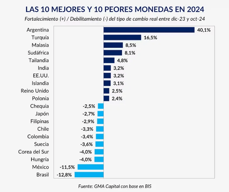 El análisis, presentado por GMA Capital fue basado en datos del Bank for International Settlements (BIS) y destacó que el peso argentino superó ampliamente el desempeño de la lira turca, que se revalorizó un 16,5% en el mismo período. El tercer lugar en el ranking lo ocupó Malasia, seguido por Sudáfrica y Tailandia. En el otro extremo, entre las monedas más depreciadas, después de Brasil se encuentran México y Hungría, junto con las divisas de Corea del Sur, Suecia, Colombia, Chile, Filipinas, Japón y Chequia.