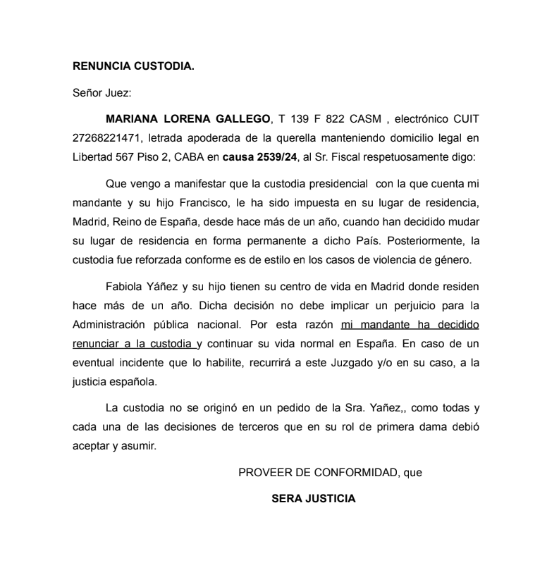 El documento menciona que, ante cualquier eventualidad que requiera medidas de seguridad, Yáñez acudirá a las autoridades judiciales competentes, ya sea en España o en Argentina.