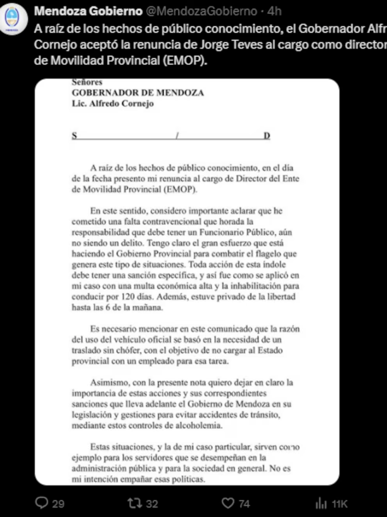 Luego de haberse conocido la noticia de que Jorge Teves, un funcionario de Mendoza, quedó inhabilitado por haber dado positivo en un control de alcoholemia mientras circulaba en un auto oficial, trascendió en las últimas horas que presentó la renuncia ante el mandatario provincial, Alfredo Cornejo. Se trataba del titular del organismo que controla el transporte público.