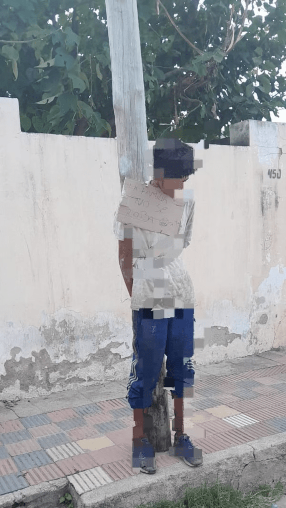 Un joven de 21 años apareció atado el lunes a un poste de alumbrado público con un cartel colgado en su cuello que decía “A la familia no se le roba”. El hecho se registró cerca de las 7 de la mañana, en el barrio Maldonado de la ciudad de Córdoba.