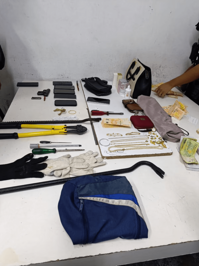 Los efectivos lograron reducirlos a pocas cuadras y, una vez detenidos, procedieron a la requisa del vehículo, en el que se encontró un bolso con más de un millón de pesos, siete teléfonos celulares, joyas —2 relojes, 4 pulseras, 3 cadenas y 12 pendientes dorados—, una pinza corta cadena, dos barretas, guantes, destornilladores, y una pistola Eibar España calibre 7.65 con siete municiones en su cargador, además de cinco balas calibre 32 largo.