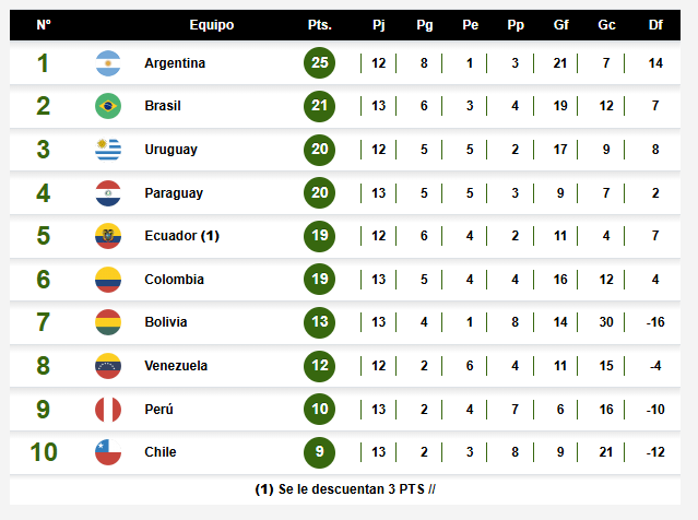 - A Ecuador se le descontaron 3 puntos por la mala inclusión de un jugador en las Eliminatorias anteriores