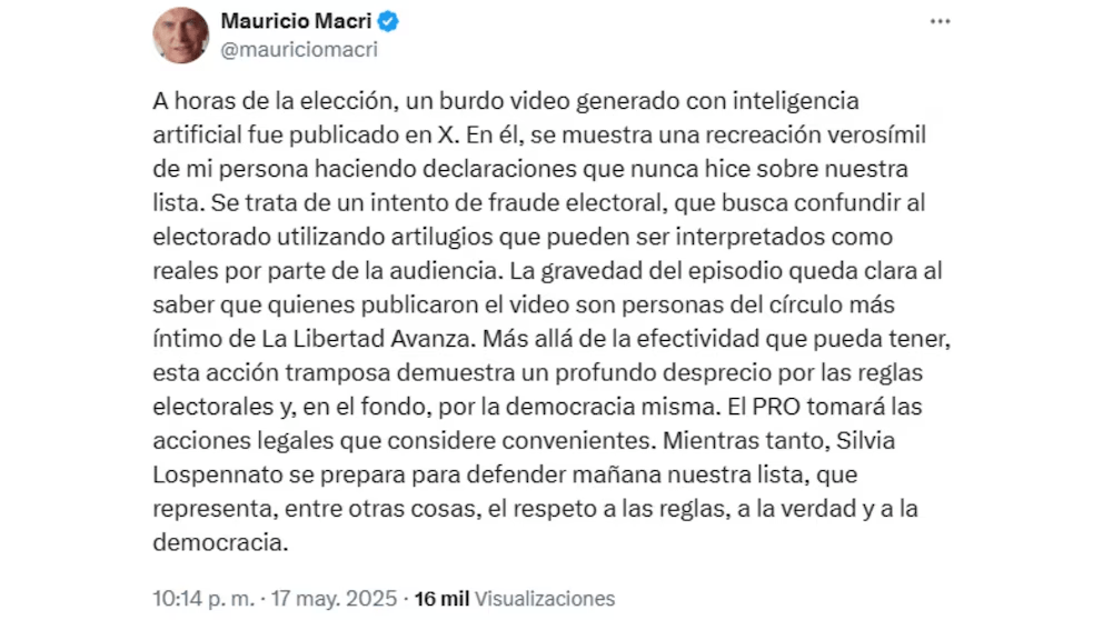 El Tribunal Electoral de la Ciudad de Buenos Aires emitió esta madrugada una resolución tras la denuncia del PRO, en la que ordena retirar las publicaciones de la red social X que contenían un video realizado con Inteligencia Artificial en el que el expresidente Mauricio Macri anunciaba la baja de la candidatura de Silvia Lospennato.