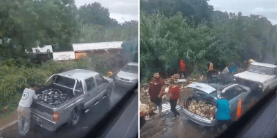 Con carretillas, saquearon un camión que volcó con decenas de cajas de vino
